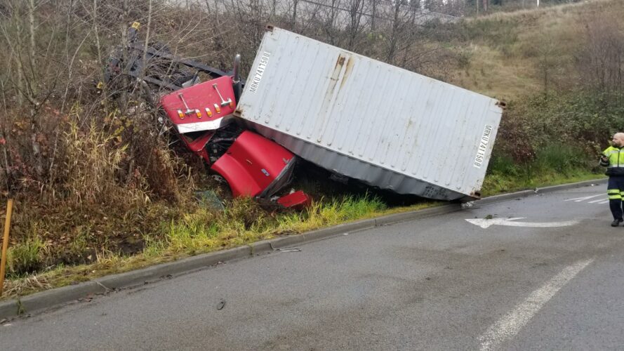 In this incident, Pro-Enviro was called in to help with an overturned tractor-trailer that had gone off the road at E. Valley Access Road in Auburn, WA. The trailer was loaded with quartz countertops and was severely damaged. It had also spilled a large amount of diesel fluid across all lanes, which was running into the drainage water. This required immediate fuel spill cleanup which we were quick to respond to.