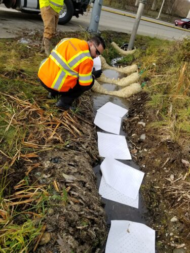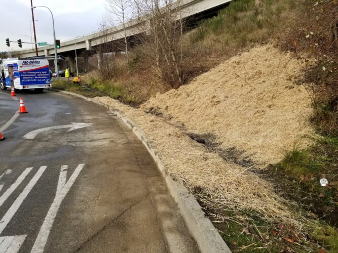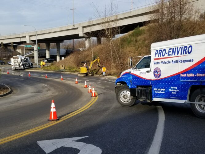 We arrived on scene with the Valley Regional Fire Authority, Auburn Police Department, Department of Ecology and the City of Auburn. Pro-Tow also arrived with the appropriate equipment and team for both incident management and recovery. Pro-Enviro arrived with a fluid spill response vehicle. We assessed the situation and formed the necessary steps for a safe recovery plan. First thing first: we needed to quickly tackle the fuel spill cleanup.