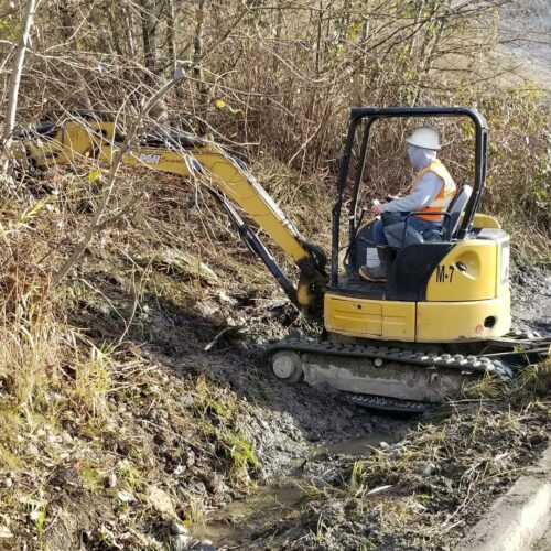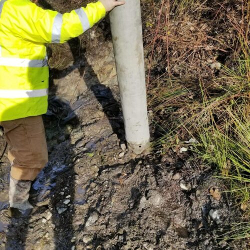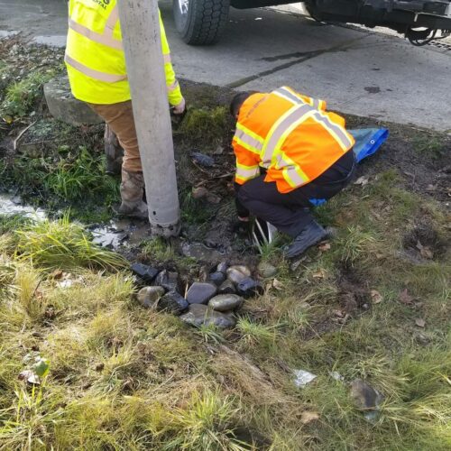 The damaged tank was then moved to a nearby safe location, and our team continued with the fuel spill cleanup. The drainage ditch had considerable fuel contamination, so it was evacuated and an evacuator truck set up to monitor and prevent any more fuel entering the storm system.