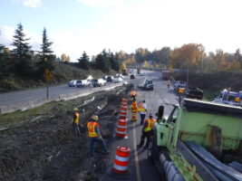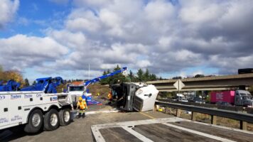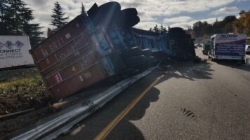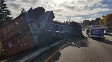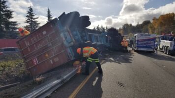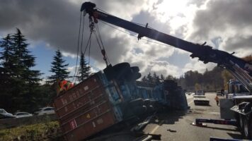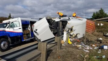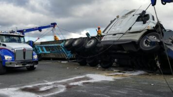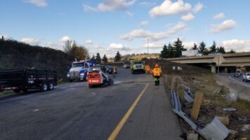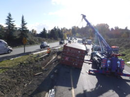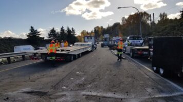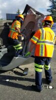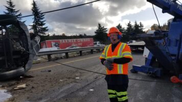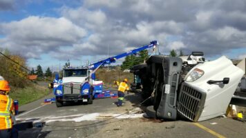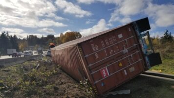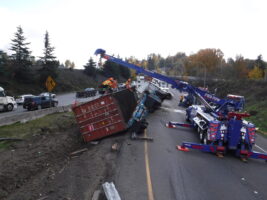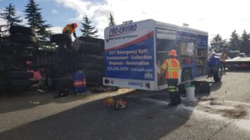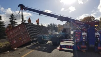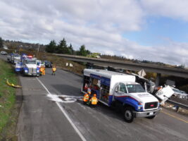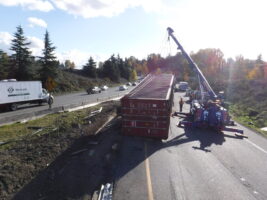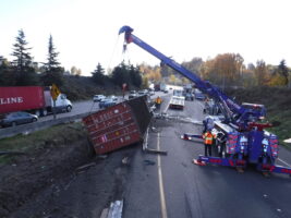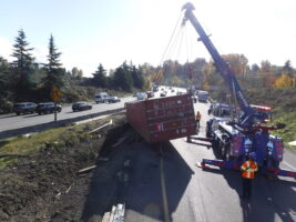Working with Washington State Police, Fire Service, and Washington State Department of Transportation, we got the driver out and recovered the container. All lanes were promptly open to traffic. Once Team Pro-Tow handled the recovery, Team Pro-Enviro stepped in to handle the hazardous spill recovery.
