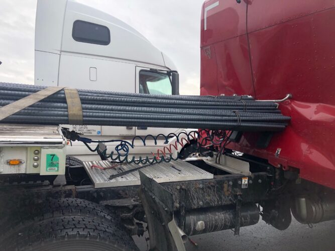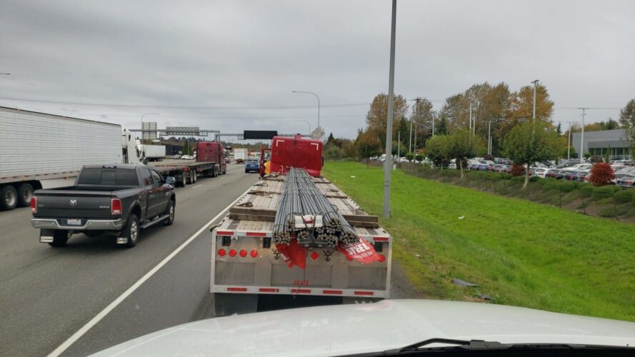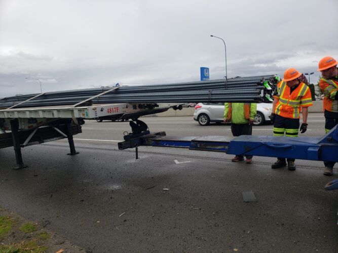 In this incident on October 21, 2019, Pro-Enviro was called to a load shift involving 50,000 lbs of rebar on a semi-truck and trailer on Southbound I-5 in Tacoma, WA. The semi-truck driver was forced to make an emergency stop after a passenger car in front of them slammed on their brakes.