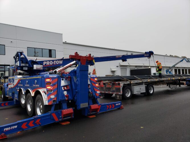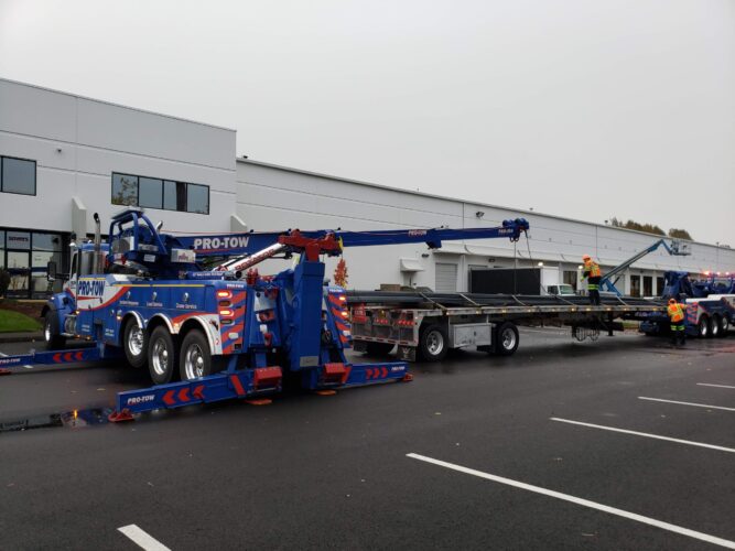 Our Pro-Tow team first disconnected the semi-trailer from the semi-tractor. This then allowed them to safely use a heavy-duty wrecker to transport it to a nearby safe location. Once there, we were able to use an overhead crane style wrecker to load shift the cargo back into a secure position. They then safely re-secured the load.