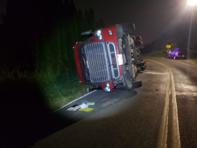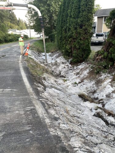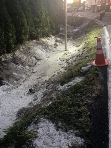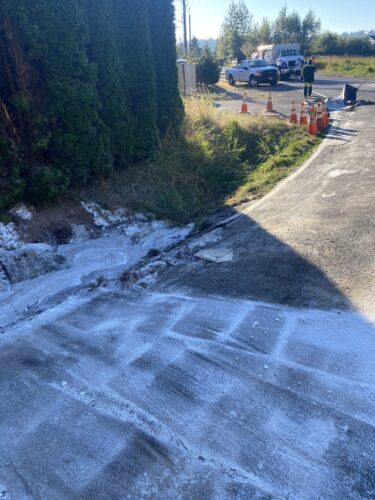 In this interesting incident, on September 6th, 2020, Pro-Enviro arrived at the scene of an overturned and fully-loaded truck and trailer in Sumner, WA. The truck was now blocking the roadway and carrying a unique load that had spilled onto the roadway. It looked like salt, but the Sumner Police Department identified it as a kind of animal feed.