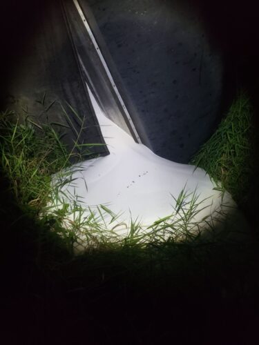 We arrived on the scene to report to the incident command post and form a plan to handle this spill recovery. In addition to the strange feed, oil, fuel, and coolant had spilled on the scene. We found a running fish-bearing stream on one side of the roadway and storm drains within 100 feet of the accident, so care was taken to protect these two areas.