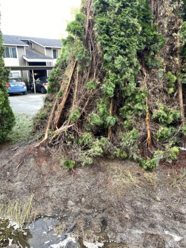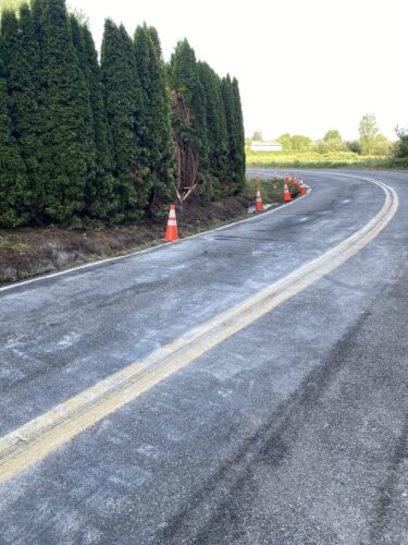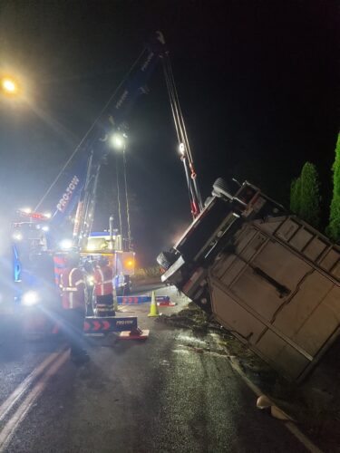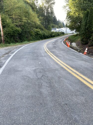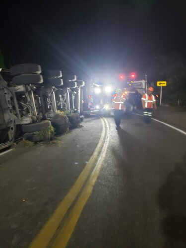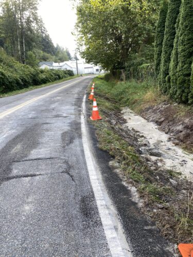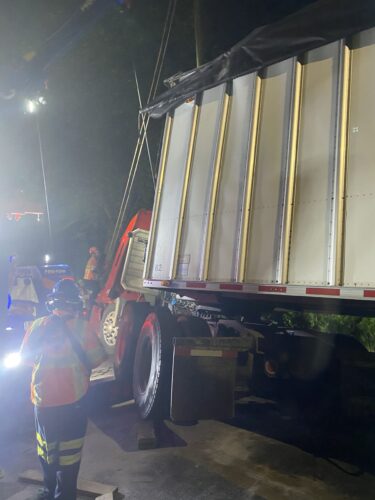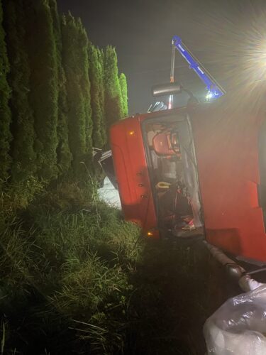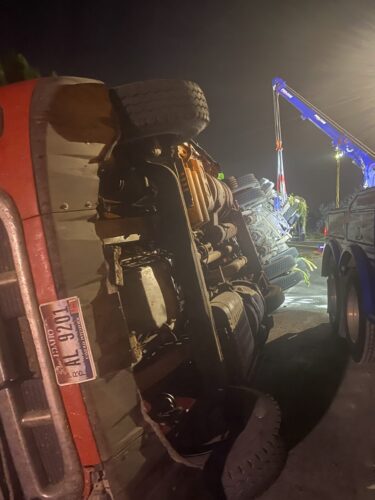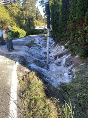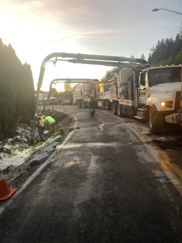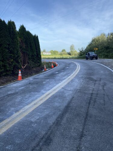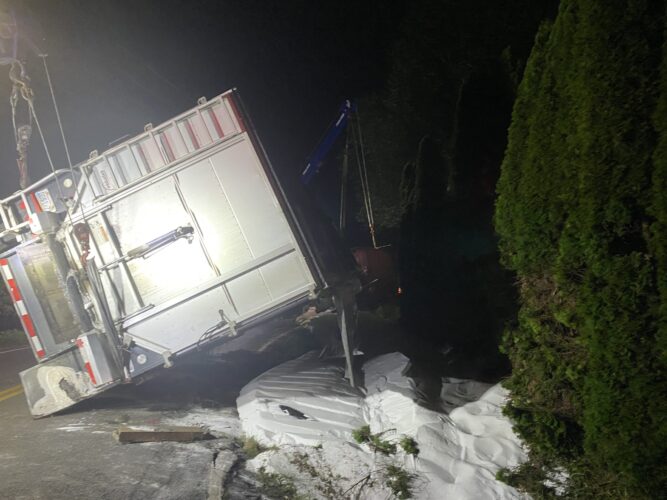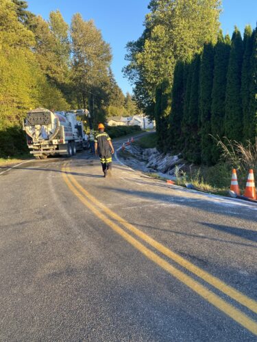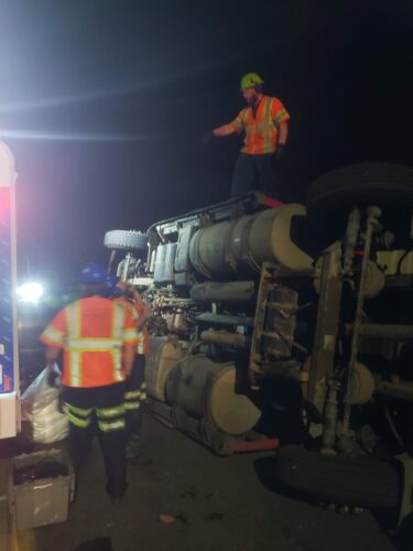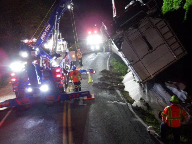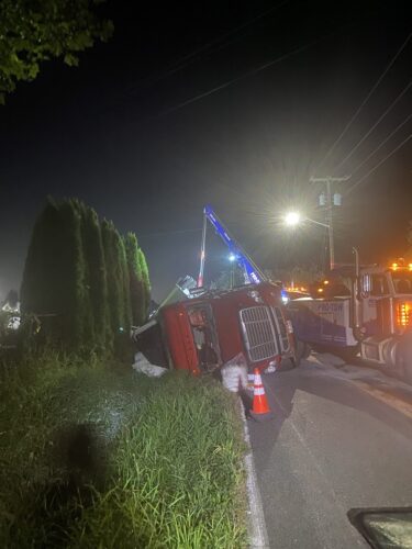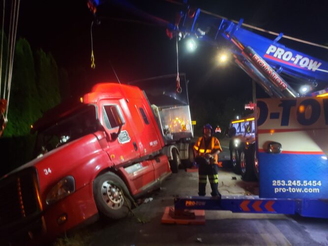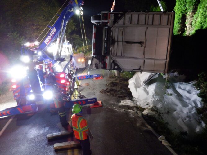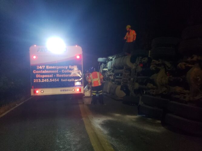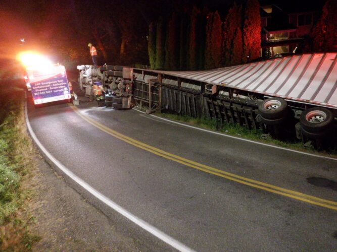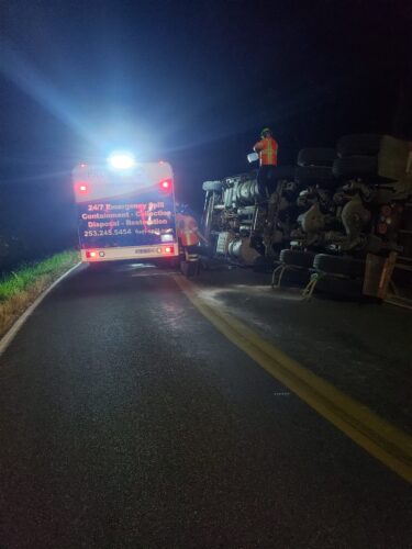 Still, our team worked efficiently and safely and soon had the truck and trailer successfully on its wheels. Now, it was time to tackle the extensive job of spill cleanup on the oil, fuel, and cargo spill roadway. We continued to the maximum practical extent, then talked with the command post and City of Sumner to confirm continued spill recovery in the morning for the remaining mess in the ditch.