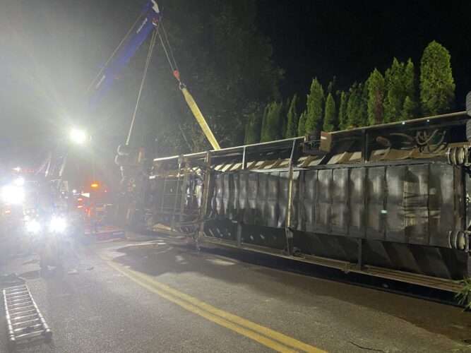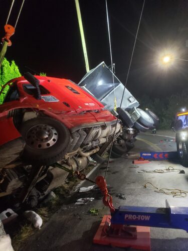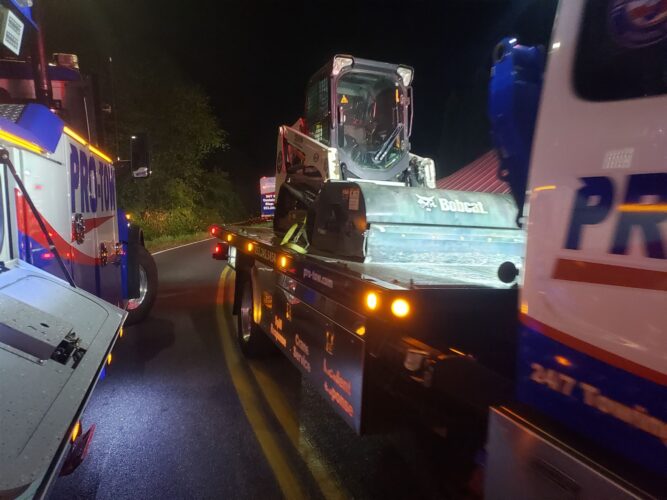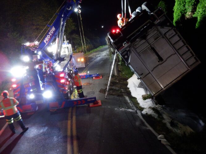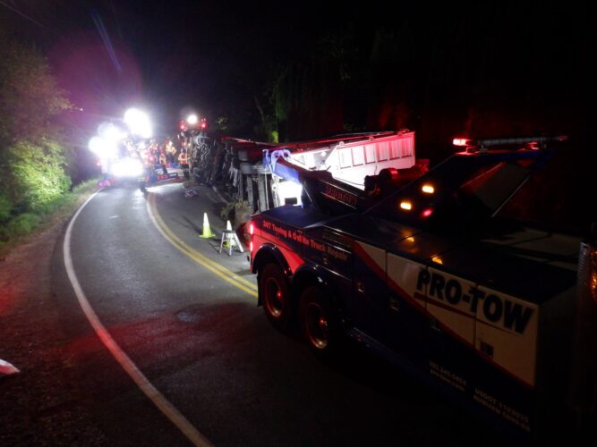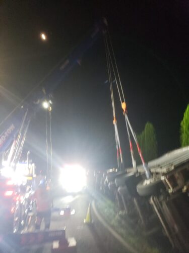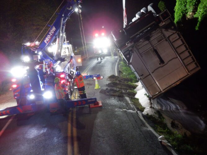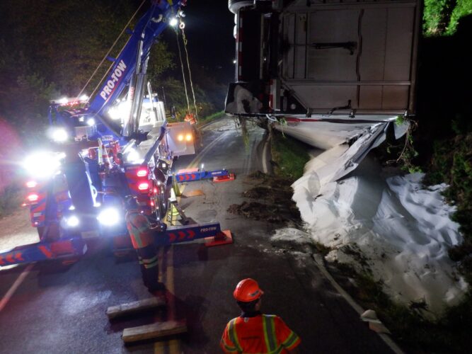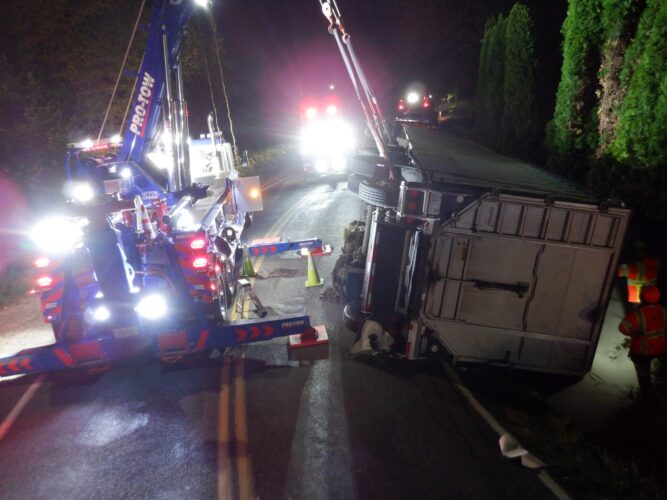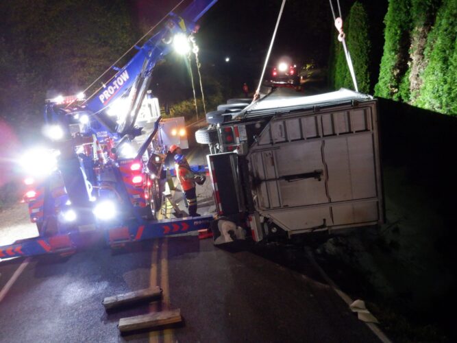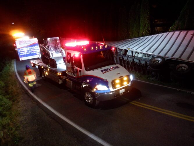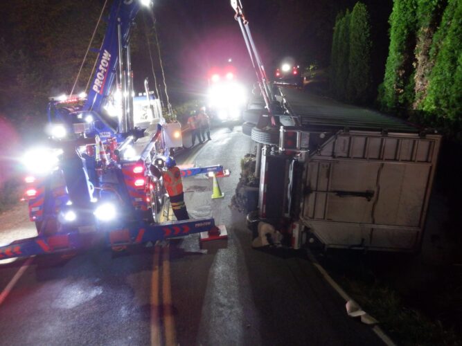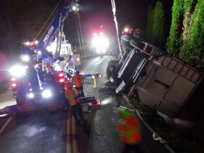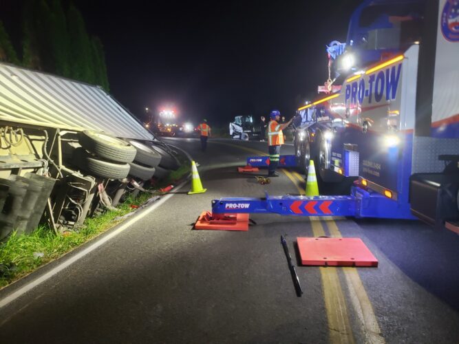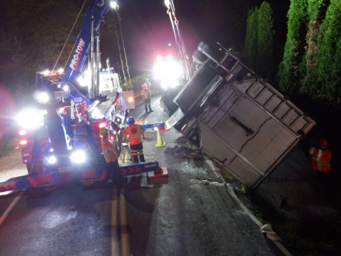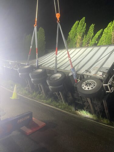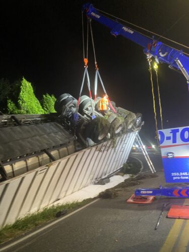 Additional equipment and help came in to handle the trailer. Team Pro-Tow continued to communicate with the command post and City of Sumner to get the trailer rightened safely. The whole incident occurred on a narrow hairpin turn and little shoulder room on the roadway to work, complicating the process.