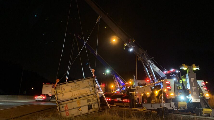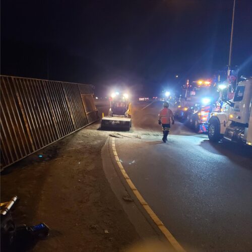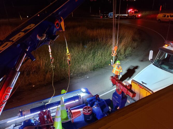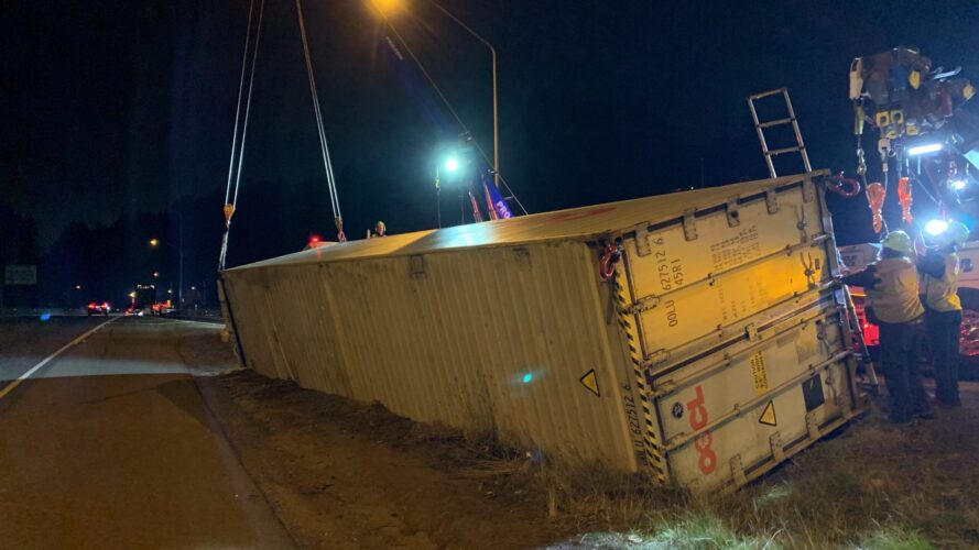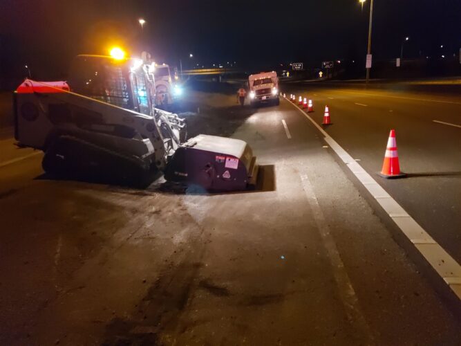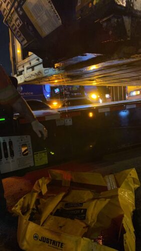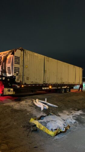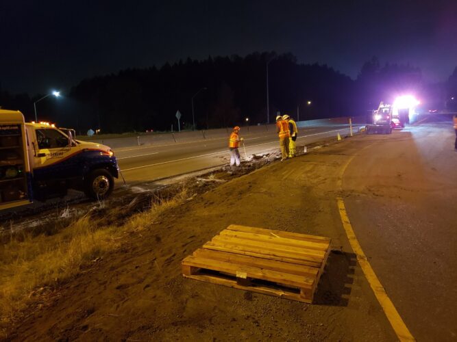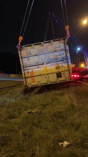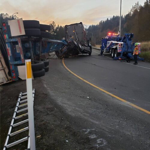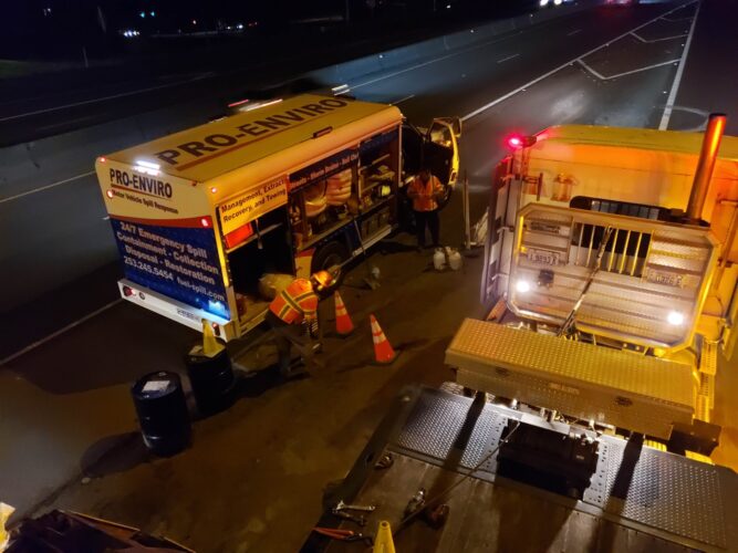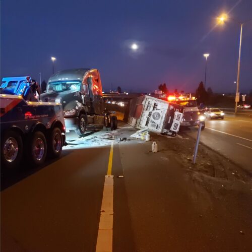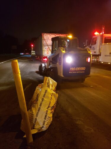 In this incident, on November 28, 2020, Our team received an emergency call for an overturned tractor-trailer on the onramp to WB SR18. The call came with a request for two heavy-duty recovery wreckers. Once we arrived, we found spill recovery was needed for the motor vehicle fluid leaking onto the roadway. It was also pooling under the nearby container. After we got written authorization from the owner to continue, Team Pro-Enviro worked quickly to tackle this issue.