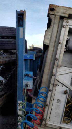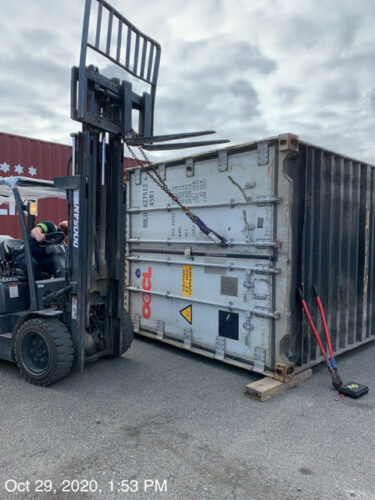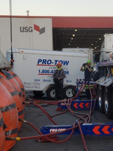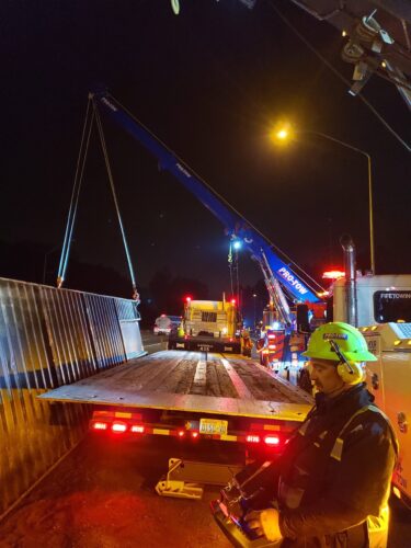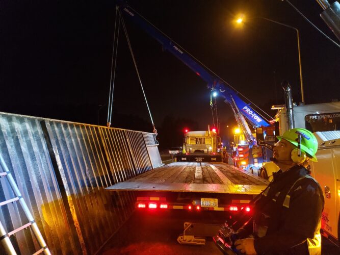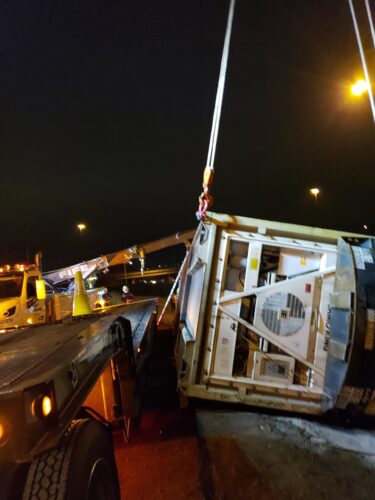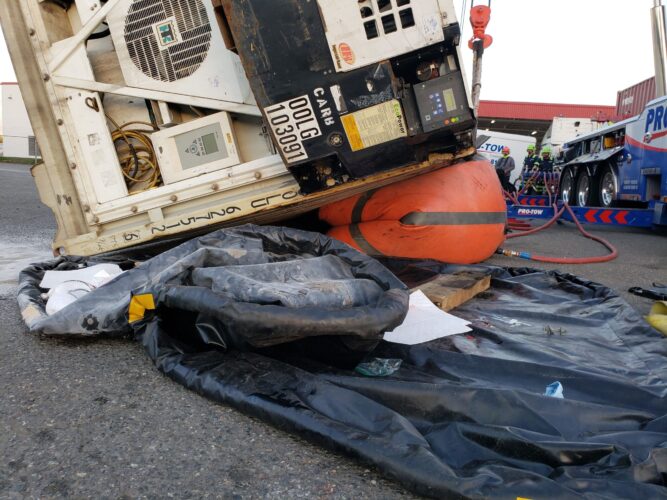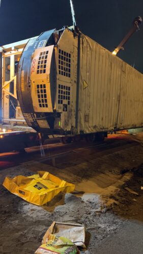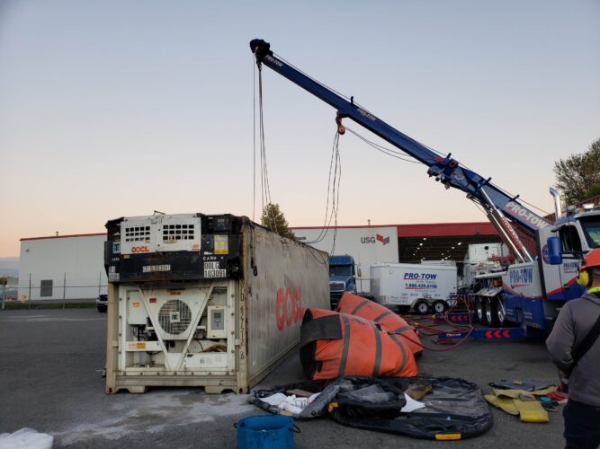 After Pro-Tow did an overhead crane lift to load the trailer onto the Landoll, a new problem sprung up. The container’s refrigerant fuel tank began to steam profusely. It was clear this was a serious and immediate safety emergency. We brought over all recovery personnel to help with safety containment and spill recovery measures.