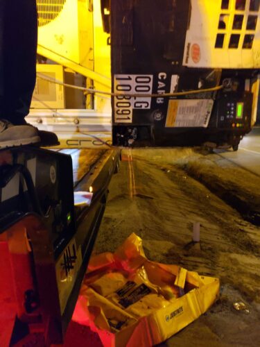 The leak’s location made it more difficult than usual to stop. This challenge led to a significant standby as our team worked to contain the leak. Still, we worked quickly and efficiently, using emergency spill control techniques until we stopped the leak again. With things safe once again, the suspended trailer could be loaded––finally.