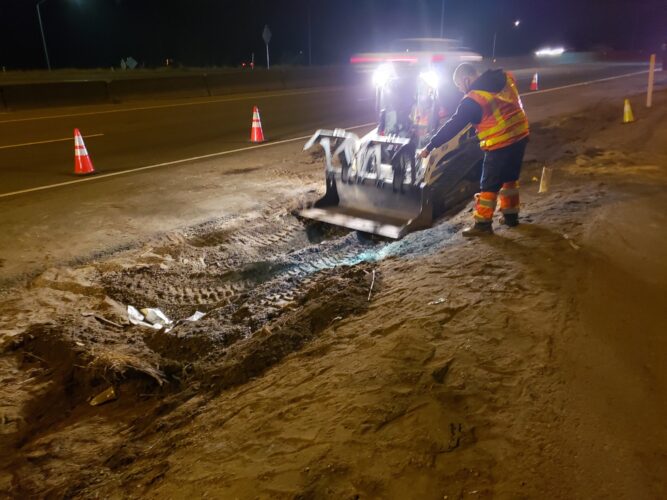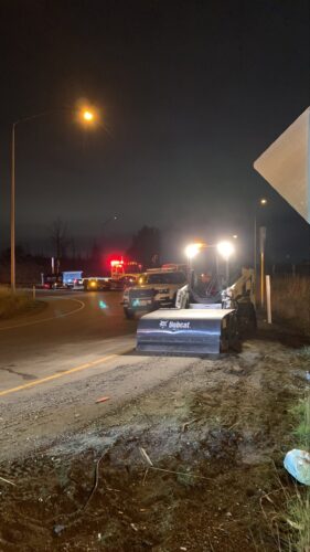 Additional equipment was necessary for the spill cleanup, so we requested a motor vehicle spill response team with the required special equipment. Handling this spill recovery included a spill response vehicle, flatbed tow truck, dump trailer, compact track loader, and specialized attachments.