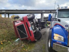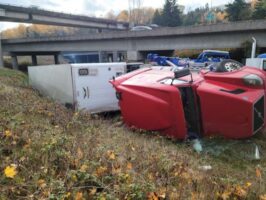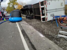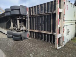 In November 2021, Team Pro-Tow and Pro-Enviro were called to the scene of an accident involving a semi-truck and trailer that had tipped over. The trailer was loaded with a mushroom product that needed cargo recovery. But first, we had to deal with the flipped-over vehicle and trailer. Once we got that trailer ready to roll, our team was fast to recover the mushroom cargo and get it reloaded.