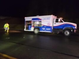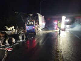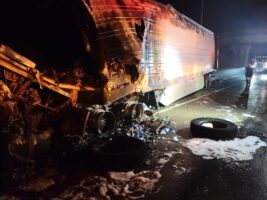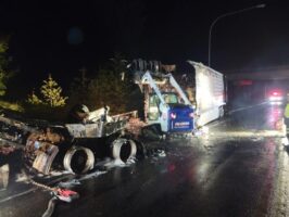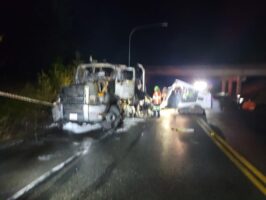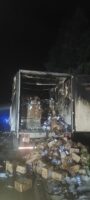 In this incident, on November 29, 2021, a truck and trailer carrying a full load of ice cream caught fire and burnt up. The boxes of ice cream and the melted ice cream ended up all over the road.