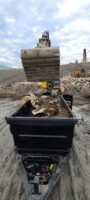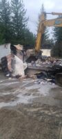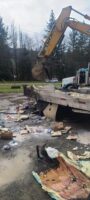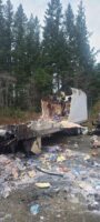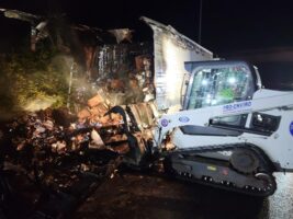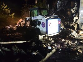 We gathered the necessary equipment, including a bobcat, and headed for the scene. Once there, we did a scene assessment before working on the trailer fire cleanup.