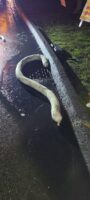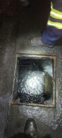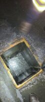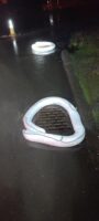 Next, our team cleared the melted ice cream mess and moved on to a nearby storm drain that also needed cleaning. Unfortunately, some debris and melted ice cream seeped in and needed remediating quickly. While our team worked on the storm drain and trailer fire cleanup, Team Pro-Tow rigged up the burned truck and trailer and lifted it onto a flatbed for transport.