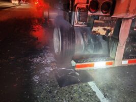 Unfortunately, the tires of the vehicle were burnt up and extremely damaged in the fire. Seeing that we needed more help, we called for additional support with the trailer fire recovery and cleanup required afterwards. Along with the damaged trailer, debris was all over the road and needed extensive cleanup.