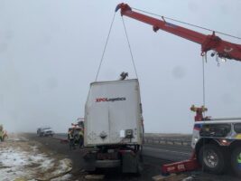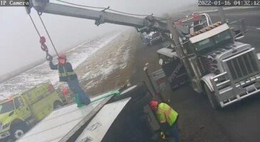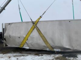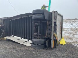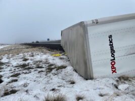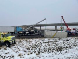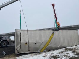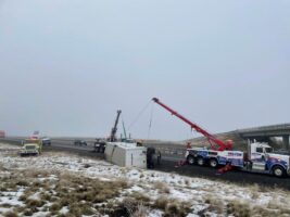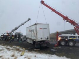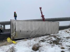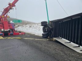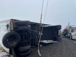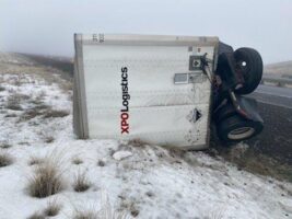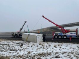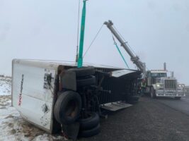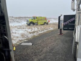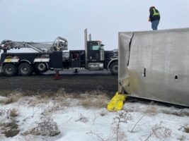 In this incident, on January 15, 2022, a truck and trailer flipped during an ice storm near Sprague, WA. Sodium Hydroxide spilled during the incident, so Team Pro-Enviro had to handle the job quickly.